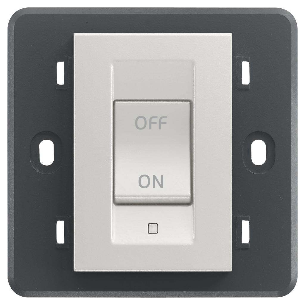 2P 32 A 250 V~ 1-way switch, lightable, with built-in frame for installation in square British standard mounting boxes, to complete with 3-module British standard cover plate, Next. Max 200 W for integrated ballast lamps (IEC 60669-1:2017)